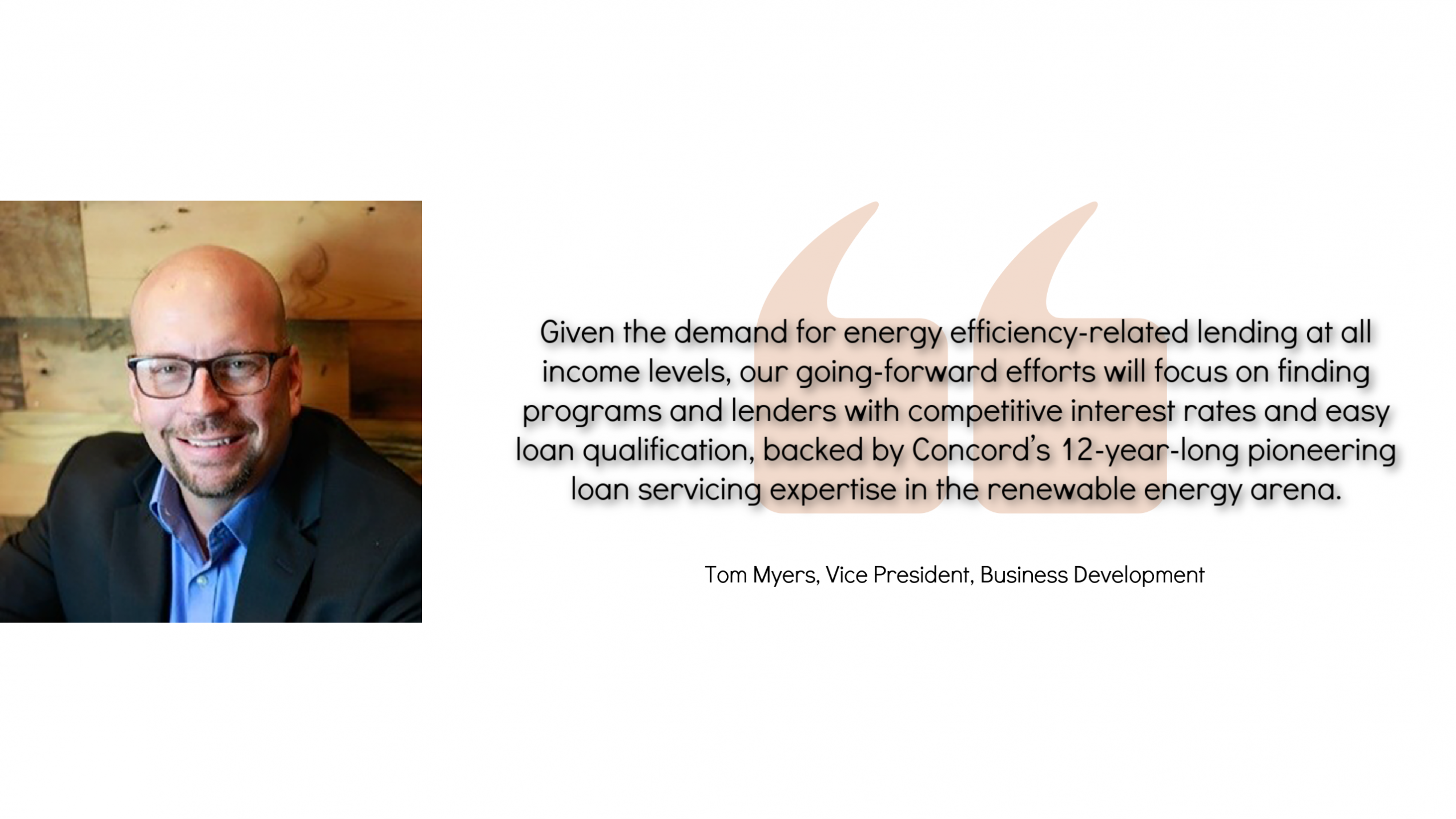 Notes Myers, “Given the demand for energy efficiency-related lending at all income levels, our going-forward efforts will focus on finding programs and lenders with competitive interest rates and easy loan qualification, backed by Concord’s 12-year-long pioneering loan servicing expertise in the renewable energy arena starting with a pilot effort through The New York State Energy Research and Development Authority (NYSERDA) in 2010.”